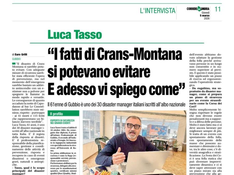 In un’intervista pubblicata dal Corriere dell’Umbria, l’esperto di sicurezza e disaster manager Luca Tasso analizza il caso di Crans-Montana e spiega perché una corretta pianificazione può prevenire tragedie. Dalla gestione delle folle nei grandi eventi fino ai nuovi modelli di sicurezza integrata: un racconto diretto di esperienza sul campo, strategie operative e futuro della sicurezza in Italia.